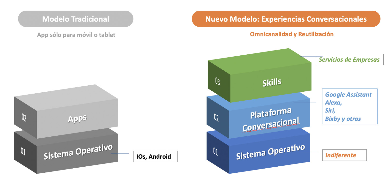 Estas Skills cambiarán el paradigma actual de desarrollo abandonando el ‘modelo tradicional’ (implementación de apps sobre IOs o Android) hacia un nuevo modelo de ‘Experiencias Conversacionales’ construyendo skills sobre Google Assistant, Alexa, Siri o Bixby (y muchas otras plataformas no tan conocidas en la actualidad).
