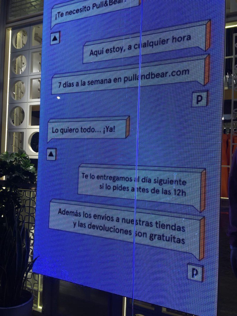 En este caso, lo que podríamos hacer es ofrecer un vídeo dinámico, divertido y conversacional con el que invitemos a los clientes a utilizar nuestro bot de Facebook Messenger, de nuestra web… Todo centro comercial o establecimiento cuenta actualmente con alguna de estas plataformas, asíque aunque el proceso será algo menos dinámico, también brindará al usuario la información que está buscando. Esta propuesta ya la está implementando Inditex en Pull&Bear. A través de un vídeo que ser reproduce en las pantallas de los escaparetes y de la propia tienda, el cliente descubre que en su página web cuentan con un Live Chat (por el momento) con el que obtener respuestas a sus preguntas.