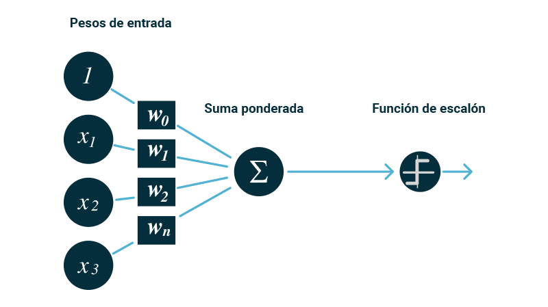 Inspirados en este mecanismo biológico McCulloch & Pitts crearon un modelo artificial de una neurona en 1943. Más tarde esta idea fue retomada por Rosenblatt quien creó una estructura llamada perceptrón. El perceptrón es una estructura la cual posee una o varias entradas, una función de activación y una salida.