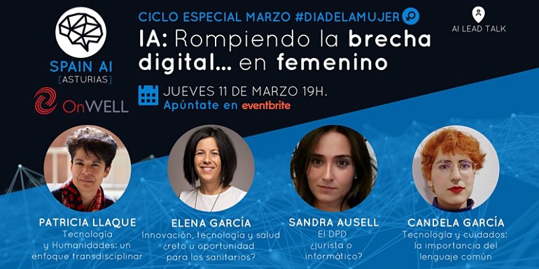 En este contexto y con motivo de la celebración del Día de la Mujer, el pasado 11 de marzo, Spain AI Asturias organizó un webinar en el que cuatro mujeres del sector de la IA analizaron a través de sus intervenciones la importancia de la brecha digital que separa el área de humanidades y el área de la tecnología. Estas cuatro expertas fueron: