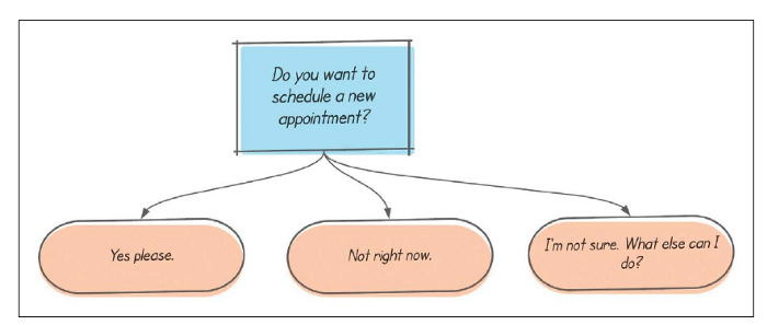 Al igual que la redacción académica, la tarea de redacción publicitaria se realiza con un nivel de detalle bastante estrecho. Para escribir las palabras que un bot podría decir, debes concentrarte en las palabras y oraciones. Pero cuando se trata de diseñar y representar la estructura de posibles conversaciones que podrías tener con el bot, el dominio es mucho más grande. Puedes comenzar con un solo turno de conversación y, según el caso de uso, eso puede ser suficiente. Pero si la conversación es más compleja (por ejemplo, solicitar un seguro, clasificar los síntomas de salud, respaldar la reparación conversacional compleja), deberás ensamblar cada uno de los turnos en una estructura conversacional general.