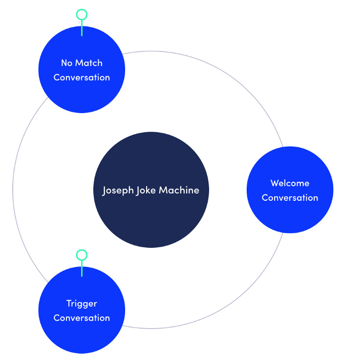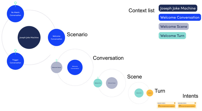 OpenDialog estructura los diseños en una jerarquía de elementos: escenarios, formados por conversaciones, formados por escenas, formados por turnos, que contienen intenciones. En el nivel superior, el nombre del escenario está en el medio con conversaciones incrustadas en un círculo circundante. El contenido de las conversaciones circundantes no es visible. Si hace clic en una de las conversaciones, inicia la vista de conversación. Puede seguir haciendo clic dentro de los elementos para iniciar esas vistas incrustadas. A lo largo del camino, se genera una lista de contexto con elementos en los que se puede hacer clic que lo llevan a la parte correspondiente de la jerarquía.