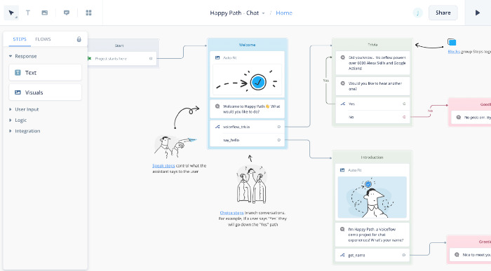 Creé una nueva instancia de Voiceflow y comencé con un tipo de chat. Después de una breve incorporación, veo lo siguiente: