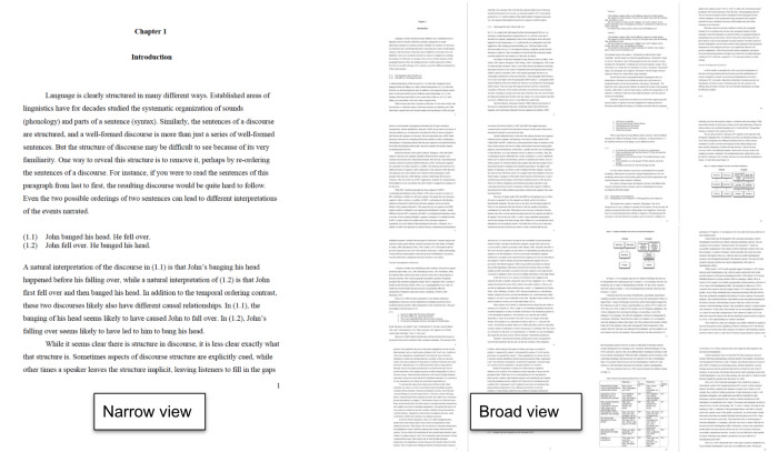 A la izquierda está la vista de página estándar que usamos mientras escribimos, con una sola página de contenido visible en la pantalla. A la derecha hay una vista más amplia, alejada de modo que las palabras y oraciones individuales ya no sean legibles. Esta vista más amplia revela cosas que quizás no vea en una vista estrecha. Por ejemplo, parece claro que el capítulo comienza con mucho texto, pero más adelante en el capítulo hay diagramas y una tabla.